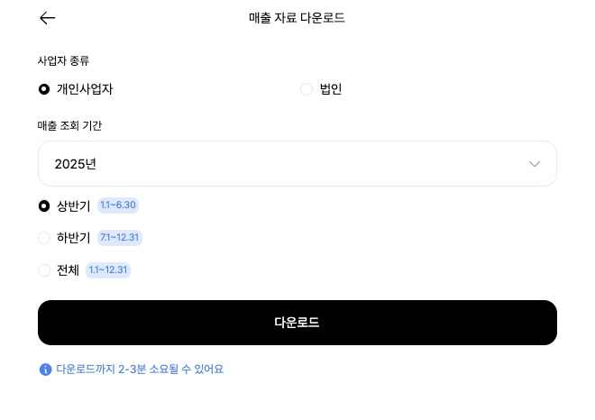 매출 자료 다운로드시 선택한 기간을 모두 조회하므로, 2-3분 소요될 수 있어요.