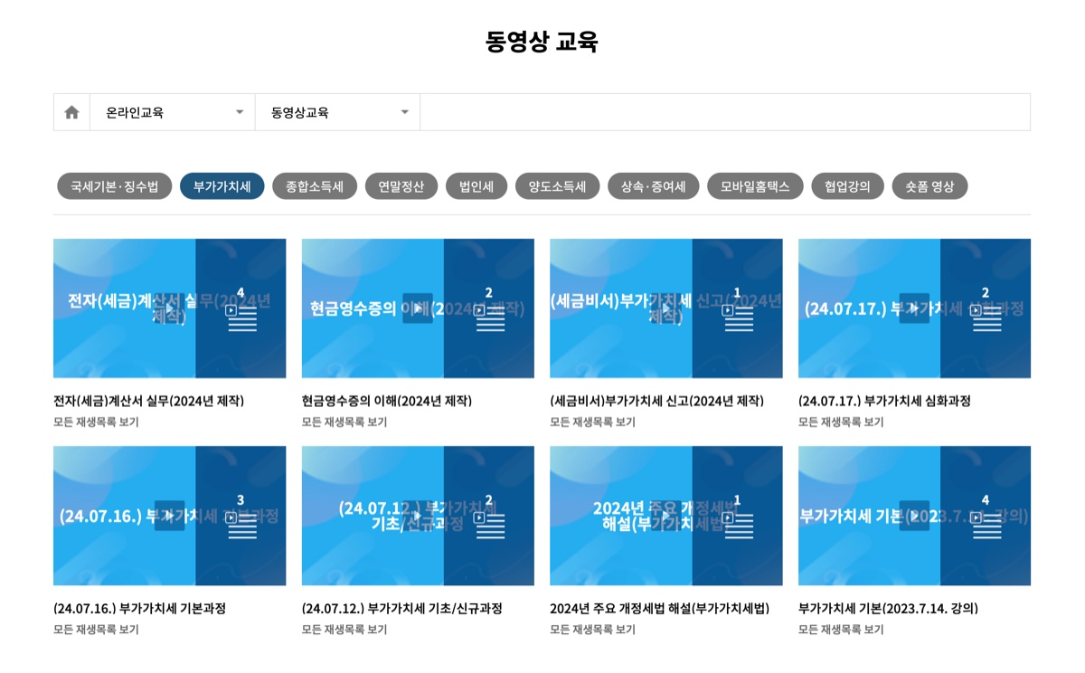 온라인 교육 > 동영상 교육 : https://taxstudy.nts.go.kr/frnt/H100024/taxEduc/renew/F/courDtaList.do?educClfCd=003&infoSeq=&dtaSeq=